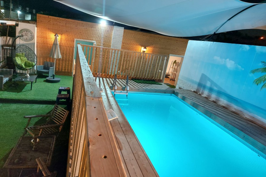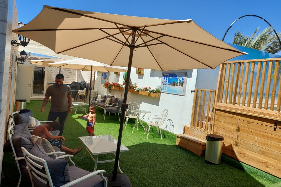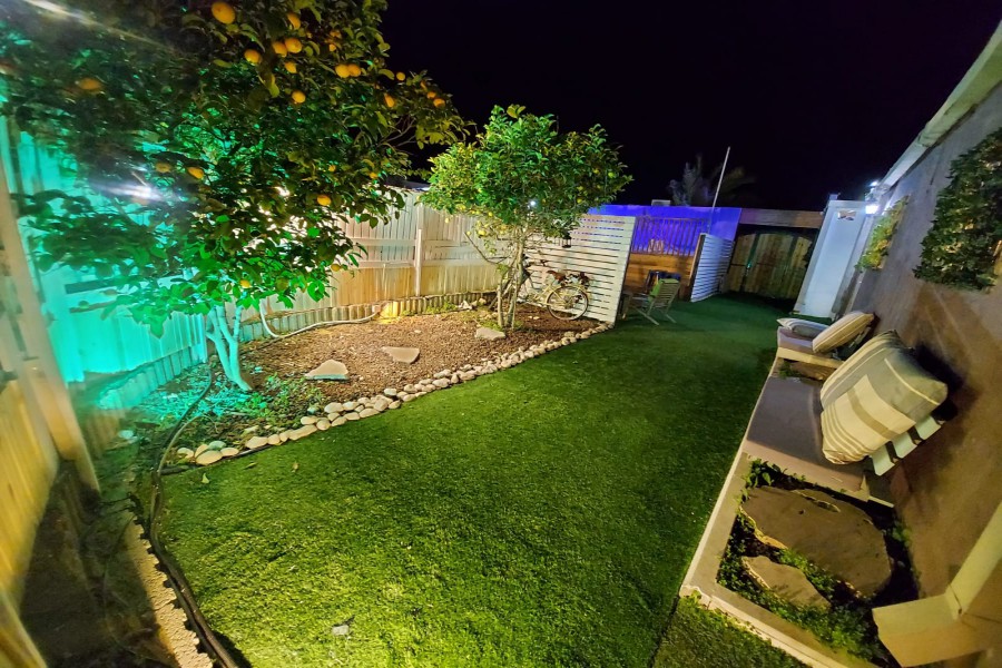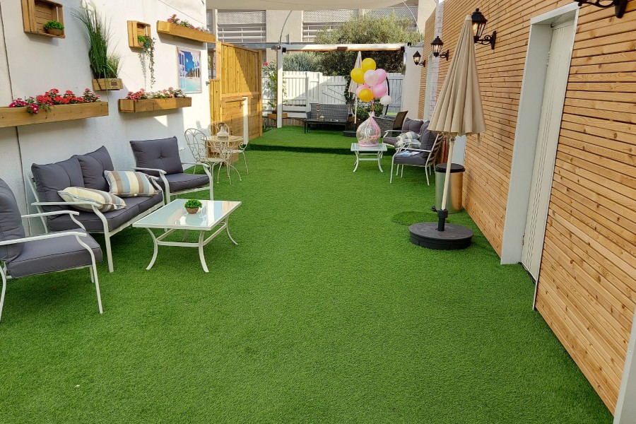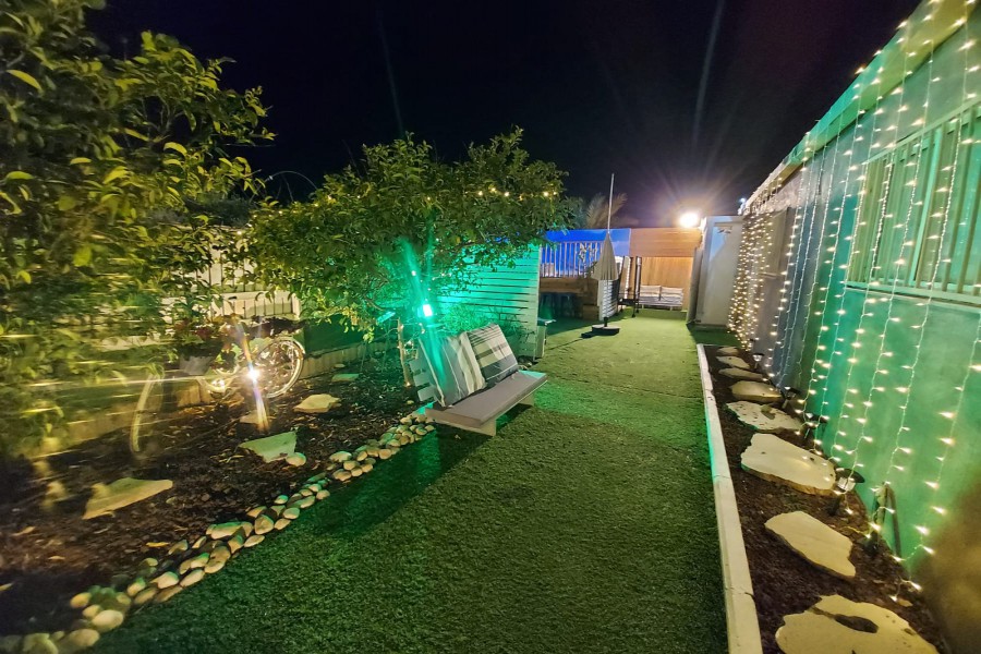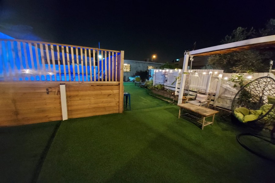 בחצר המתחם מיטות שיזוף, ספסל ישיבה, פרגולת צל, תאורה ללשעות הלילה, חנייה קרובה, ריהוט גן בחצר, שימשית צל, פרחי נוי.