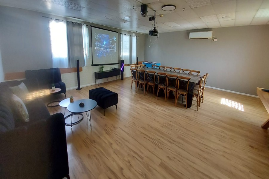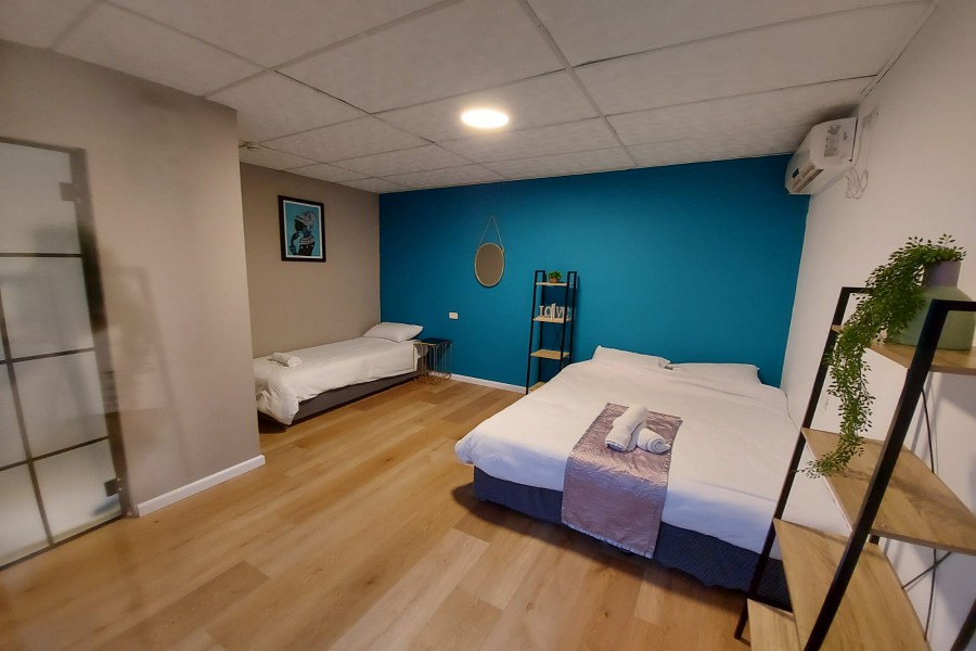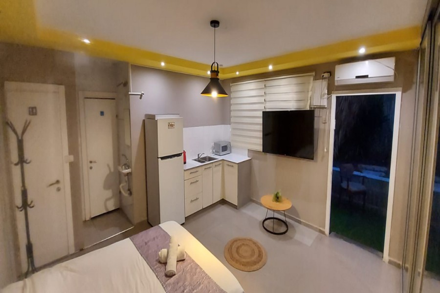מיטה זוגית, מזגן, פינת אוכל, סלון ישיבה, כדוררגל שולחן, טלויזיה, מסך פלזמה 55.